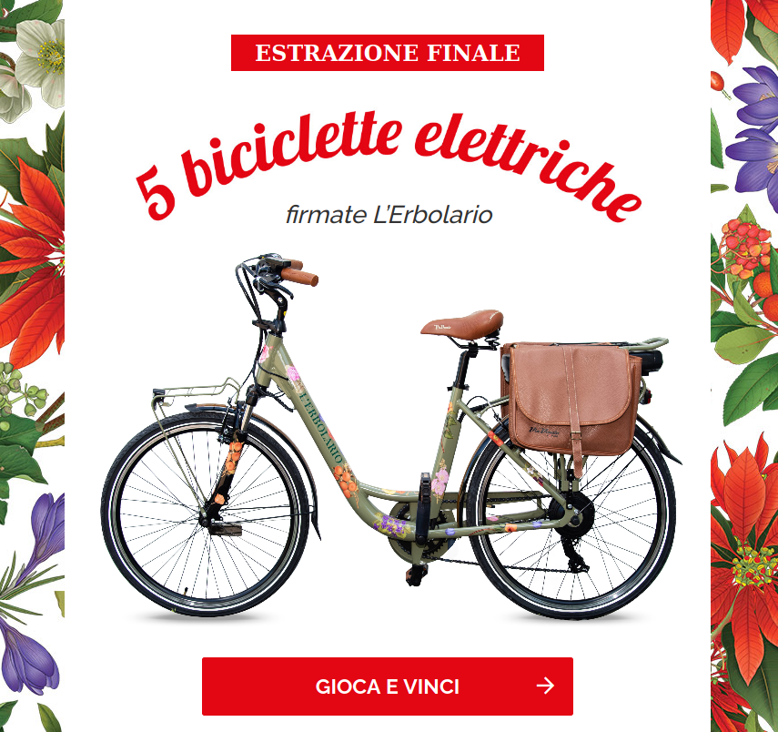 In palio: 5 confezioni regalo delle linee NOVITA’ estratte OGNI GIORNO, e l’estrazione finale di biciclette ELETTRICHE firmate L’ERBOLARIO!
